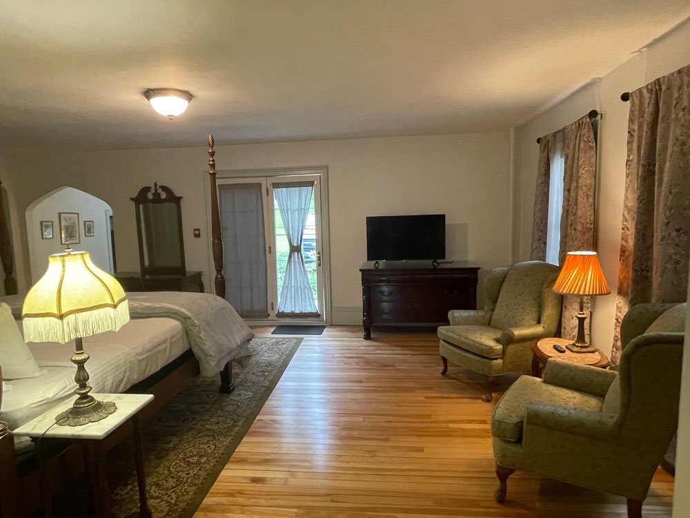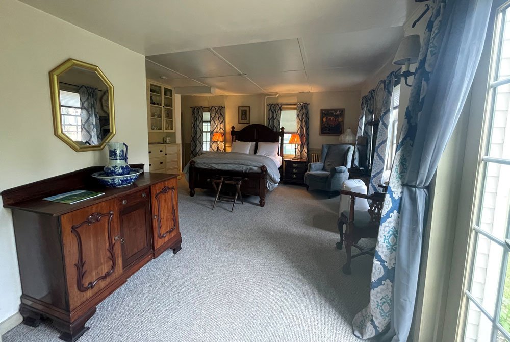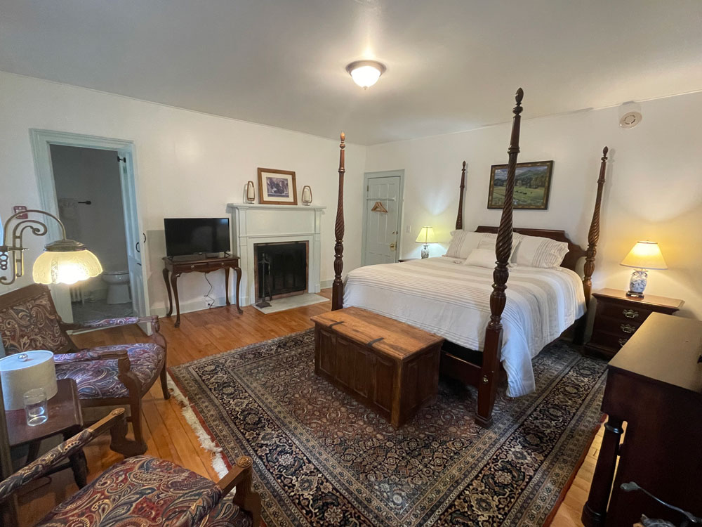 This room has a beautiful queen bed and French doors that step down to a private patio facing the side of the Main Inn. The bath offers radiant heated tile floors and a beautiful walk-in shower.