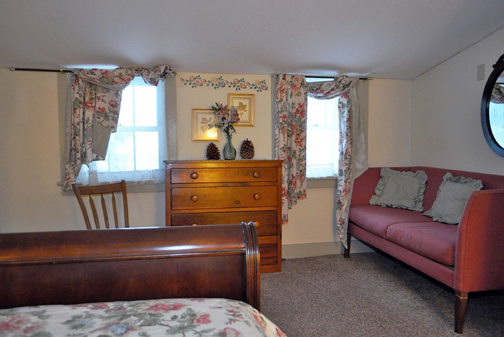 The stairs to the second floor are part of this guest room. To the right is a bedroom with a queen bed. To the left is a sitting room with a twin day bed, table & chairs. The bathroom offers a claw foot soaking tub with a shower enclosure.